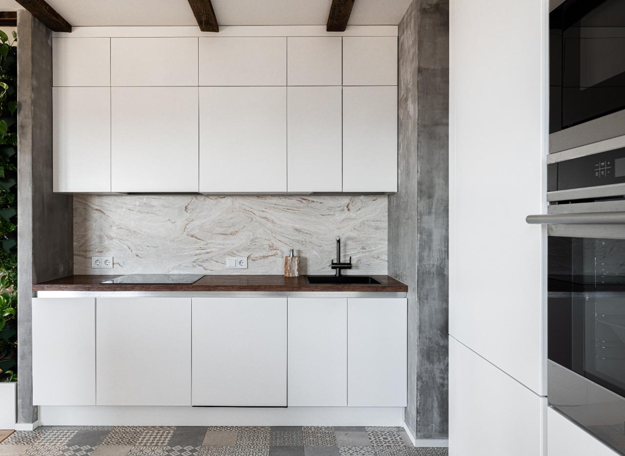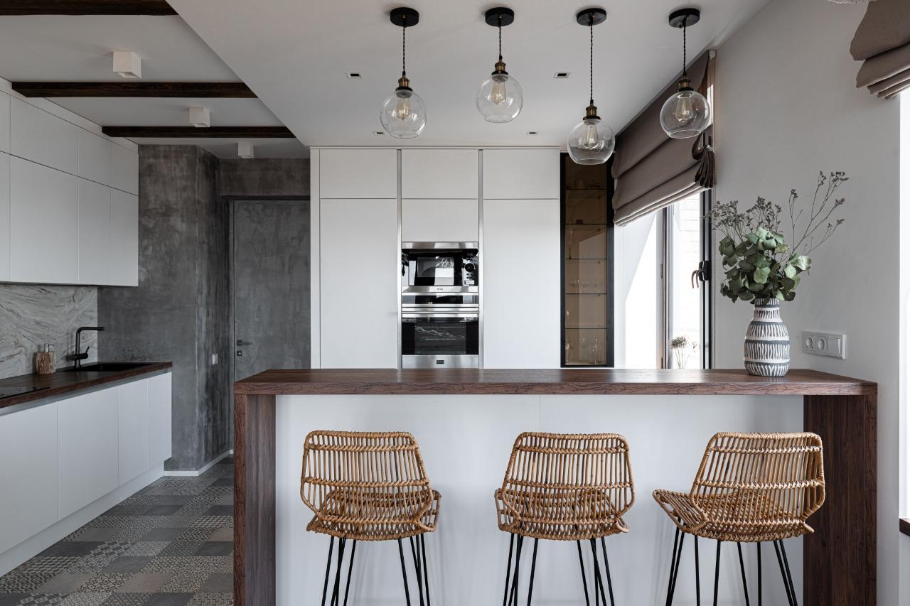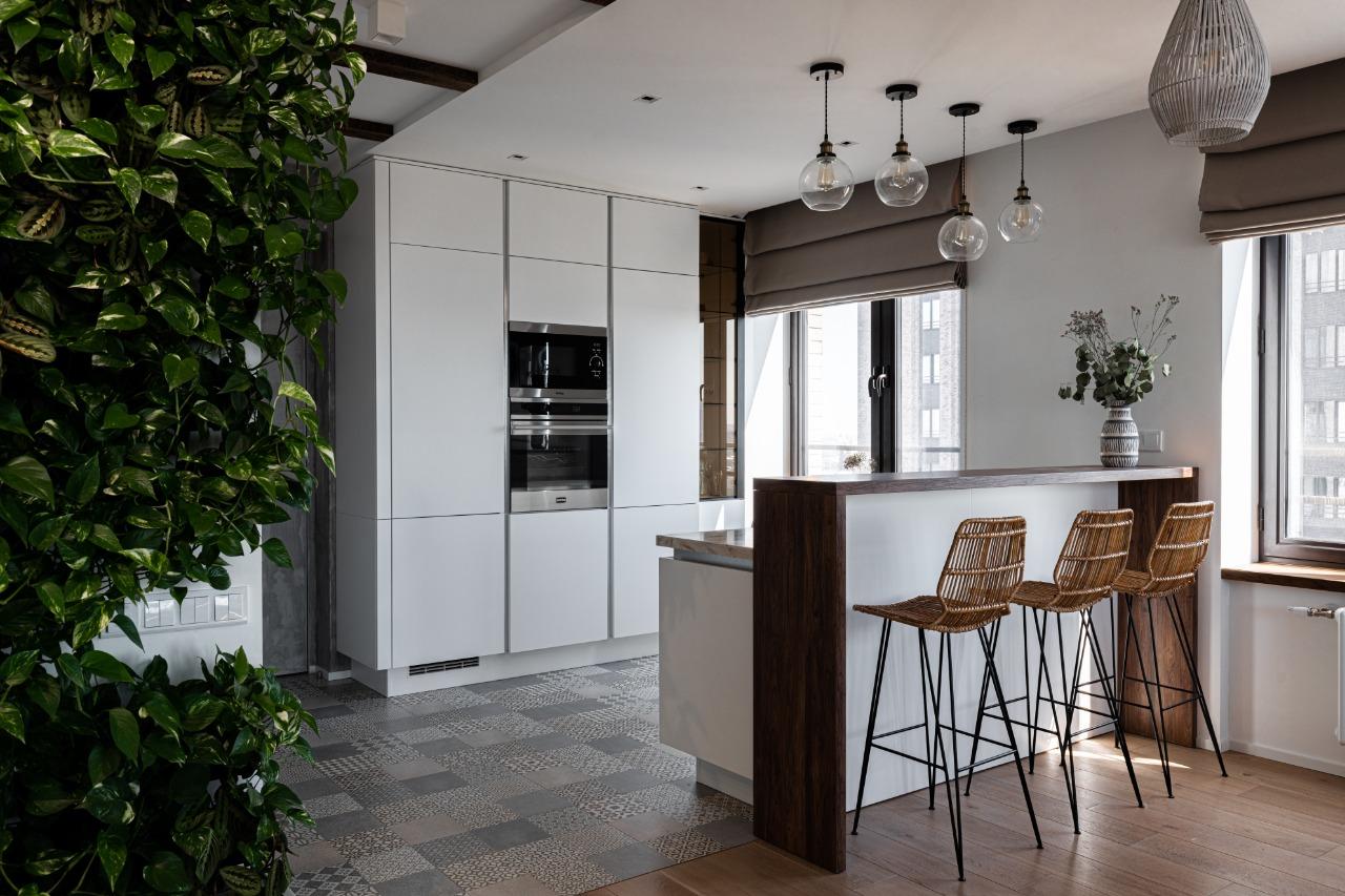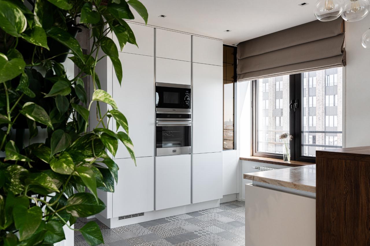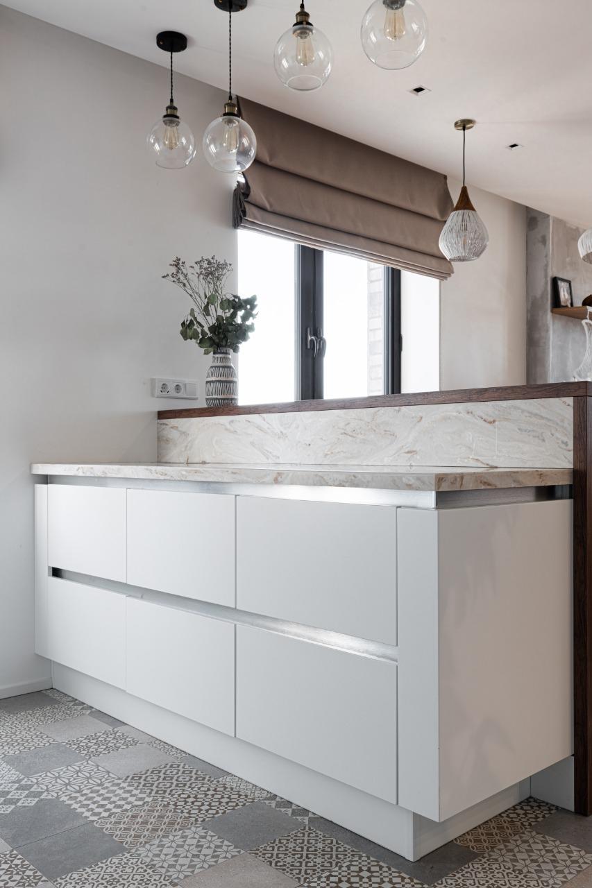 О проектеОписаниеПроект, который ассоциируется со свежестью, чистотой и воздушностью - он полностью олицетворяет образ своей заказчицы - великолепной Риты Дакоты. Проект расположился в три ряда - зону готовки, функциональную зону, в которой нашли место колонны под технику, и обеденную зону в исполнении острова. Для реализации проекта была использована модель Джаз Интуит в белом оттенке. Она очень точно подошла под интерьер и не слилась с ним, а наоборот - акцентировала его. Интерьер кухни полностью повторяет образ райского острова, который так любит посещать заказчица. Столешница рабочей зоны и барной стойки выполнена из ДСП, цвет "дуб натуральный". Столешница острова и стеновая панель изготовлены из искусственного камня.